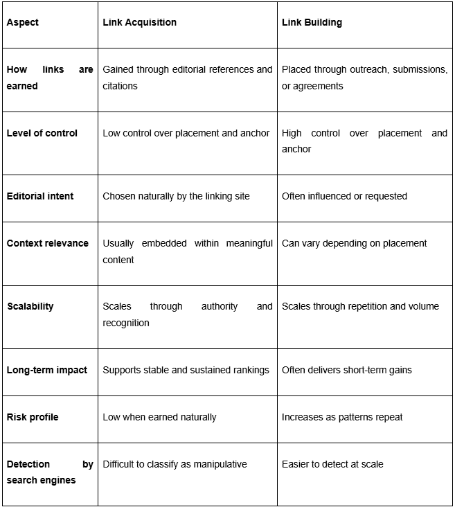 Link building is driven by control and execution. Link acquisition is driven by credibility and editorial choice. Understanding this distinction helps avoid strategies that work briefly but fail to sustain rankings.