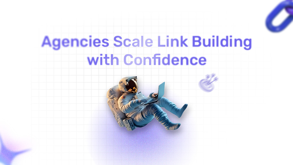 Astronaut in a spacesuit floats while using a laptop against a grid background. Text above reads, "Agencies Scale Link Building with Confidence," conveying innovation.
